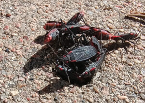 They are harmless and do not bite or produce any foul smells. You may see discoloration on young fruits if red shouldered bugs have been feeding on them, but they tend not to cause much damage. They often eat seeds and fruits that have fallen to the ground. I even saw them surrounding a piece of bread that had fallen on the street. In the winter you might find both adults and nymphs in your home or garage as they look for somewhere warm to shelter. Outside they will look for natural or human made crevices during cold weather. If they come into conflict with your space you can sweep up the fallen plant material and move it to a better location where you won’t mind the bugs.