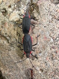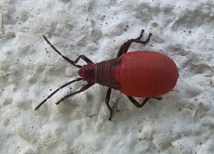 Their name haematoloma means “blood-fringed” referring to these markings. Adults have variation in the length of the wings, so you might see some with full wings, (called macropterous, “large-winged,”) and others with slightly reduced wings (called brachypterous, “short-winged.”) While the full winged individuals are able to fly to help the population reach new areas, the short-winged individuals lack flight muscles. The small nymphs are mostly red with a brown thorax (midsection,) antennae, rostrum, and legs. As they grow, they gradually turn black with red markings and wings will develop from small pads on their back.
