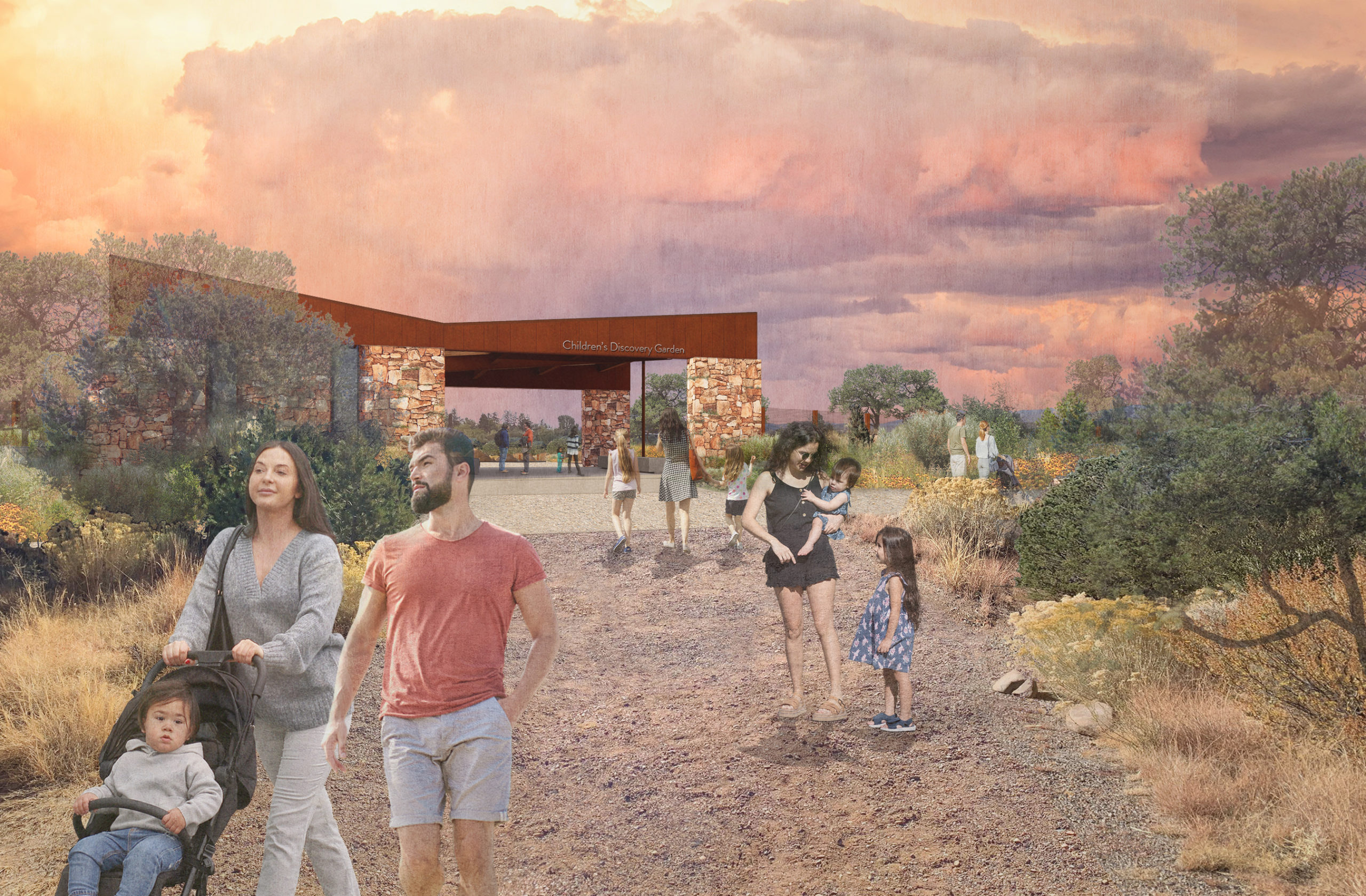 The Children’s Discovery Garden is designed to engage children and families and encourage an awareness and love for the natural world. Exploration and unstructured play will promote curiosity and investigation into the science and conservation of our surroundings. Set among native piñon and juniper, the Children’s Discovery Garden is accessed through a shaded Gateway Pavilion with family restrooms.