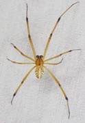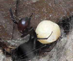 Females can live up to a year and a half, while males only live about a month or two. You can sometimes see male widows perched in the webs of females, hoping to snag some food. They mate during summer and can lay between 4 – 9 egg sacs in a season. Egg sacs are round, white or tan and about 1 cm in diameter, typically nestled into the web with the female spider nearby. The eggs develop in about 14 days and the cannibalistic young fight amongst themselves within the egg sac, leaving only a few to survive and grow into adults. The spiderlings remain near the web at first and eventually climb to a high point, spin a balloon of silk and drift on the wind to a new spot to build their web. This time of year the females and immatures are overwintering in warm places like sheds or houses, but as temperatures warm up they may begin to emerge.