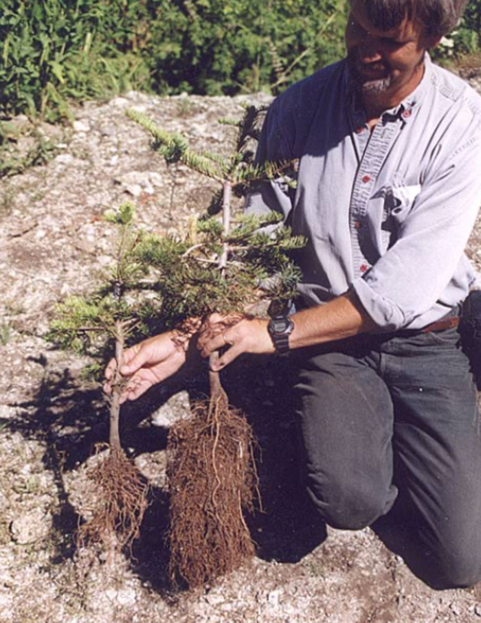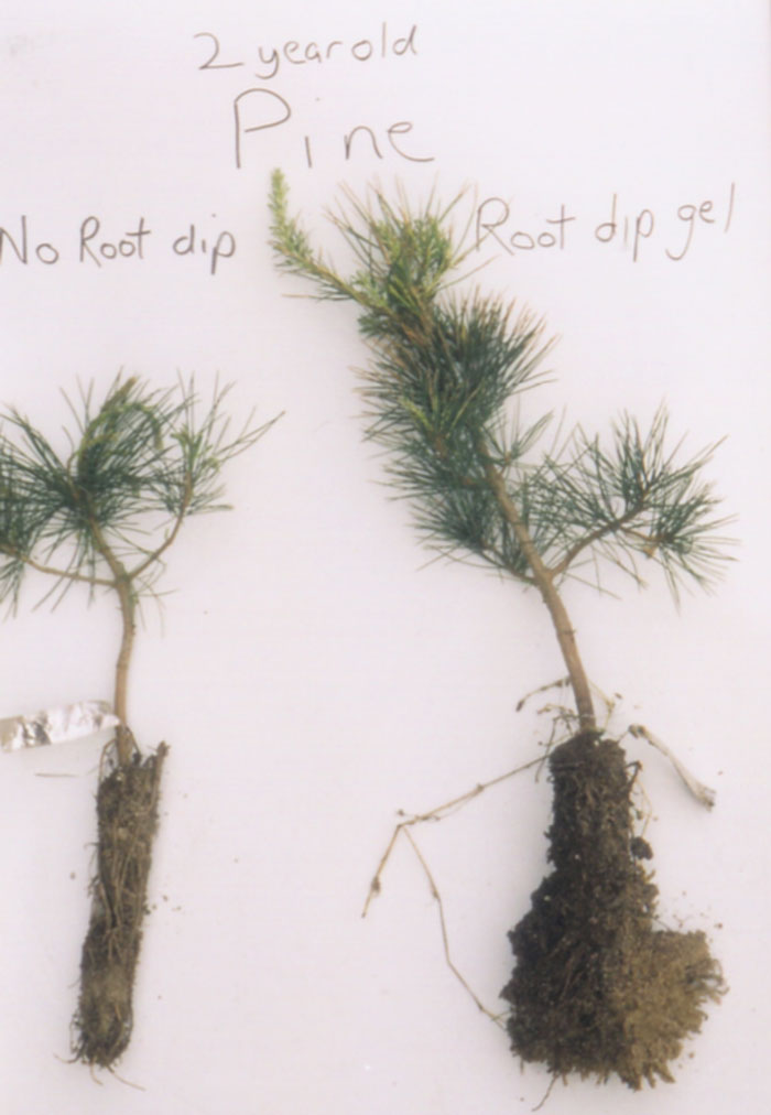 Below are examples of two-year growth in pine seedlings. The one on the right received a mycorrhizal fungi stimulant in form of a root dip gel.
